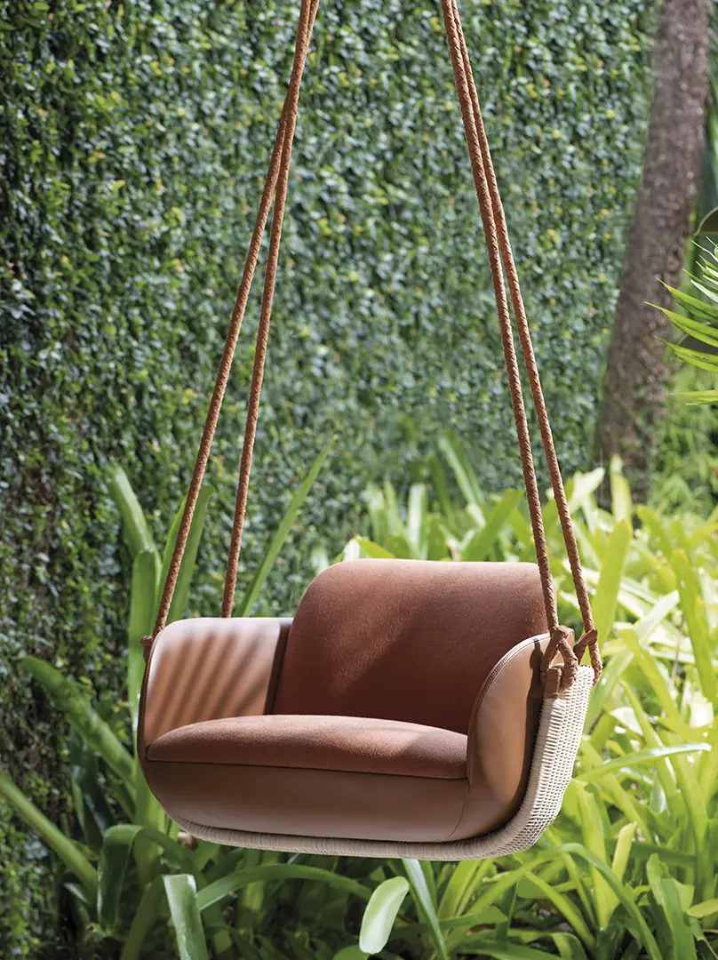 “É como se fosse um outdoor para a alma, pois a casa se converteu numa válvula de escape mental”, resume. Organizada em três moods distintos (Jornada, In Natura, Naive), a Edition 2021 evoca momentos de alegria não muito distantes da gente: a efervescência dos anos 1960 na costa italiana e em enseadas como Rio e Guarujá. Mas, como traduzir esses conceitos para o mobiliário? “Quer coisa mais lúdica do que uma cadeira de balanço?”, responde Anastassiadis, citando uma das novidades do ano. “Estamos trazendo esses componentes relativos à memória afetiva. Não estou indo ao encontro de formas surreais, pelo contrário. Estamos buscando shapes inaugurais, que remetem aos primórdios da vida. Pureza e descomplicação. Os móveis estão mais despojados, descontraídos – mais naturais”. A proposta sintetiza um modo de consumir mais consciente, sustentável e inteligente neste mundo transitório-permanente. “Não podemos sair iguais de tudo isso que estamos vivenciando enquanto civilização”, diz. Na prática, são móveis que sugerem a evolução de peças pré-existentes – a exemplo do sofá que vem atualizado numa encarnação indoor/outdoor, ou as poltronas e cadeiras que remetem aos arquétipos tradicionais indígenas, tão comuns nas praias brasileiras.